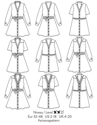 Robe chemise à l'encolure V et aux multiples possibilités: 3 options de cols (chemise, victorien ou pied de col seul) à mixer avec 3 options de jupe...