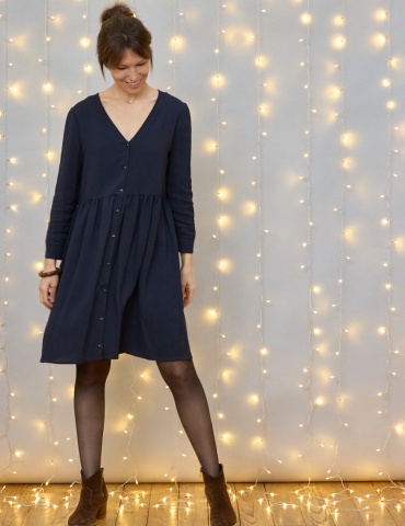 Blouse ou robe à l'encolure V finie par un biais plaqué, et prolongée par une patte de boutonnage. Manche 7/8 terminé par un poignet enforme. Blouse plutôt droite déclinable en robe à la taille élastiquée, le tout avec ou sans manche.