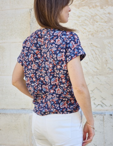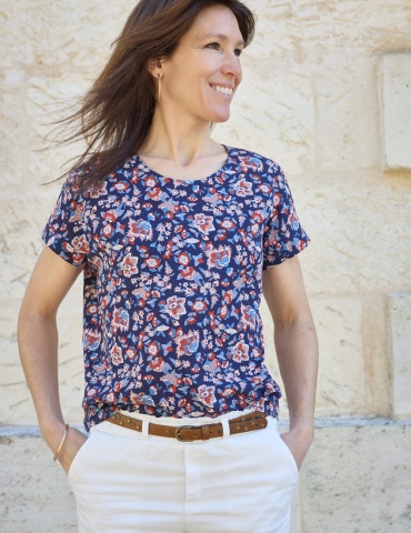 - Version viscose marine à fleurs colorées : T40, portée avec un pantalon EQUILIBRE