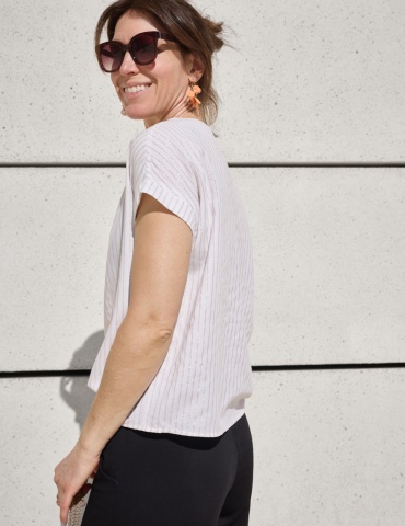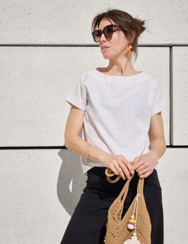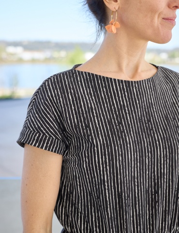 Blouse, t-shirt ou robe à l’emmanchure basse pour un style résolument cool. Le modèle se réalise en chaîne et trame ou en maille, et propose 2 formes d’encolures : ronde ou bateau. Pour chacune, finition biais, parementure ou bande jersey (pour une encolure ronde en maille). A agrémenter d’une manchette ou d’une manche courte ou très courte froncée, posée en simple ou en double épaisseur. Se décline également en robe élastiquée à la taille.